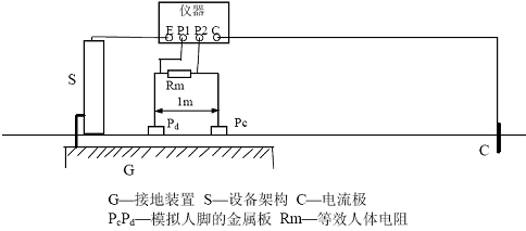 式中Is 為被測接地裝置內系統單相接地故障電流。上述測量中,若儀器電壓輸入端不并聯等效人體電阻Rm,則所得結果為跨步電位差。