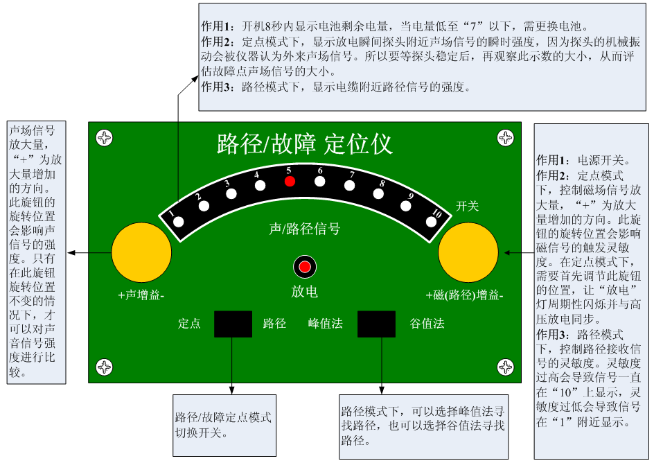 步驟2 將“定點(diǎn)/路徑”模式開(kāi)關(guān)切換到“路徑”模式然后打開(kāi)路徑/故障定位儀的電源開(kāi)關(guān),開(kāi)機(jī)8秒內(nèi)顯示電池電量(電量低于“7”時(shí)需更換電池!)。
