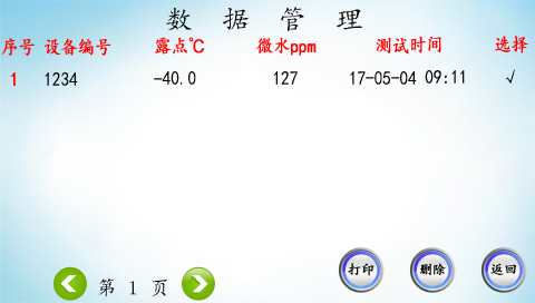 點擊“返回”,儀器返回到“功能選擇”。在“功能選擇”界面選擇“數據管理”,進入“數據查看”界面,如下圖所示??梢栽诖私缑娌榭匆郧氨4娴臄祿?/span>