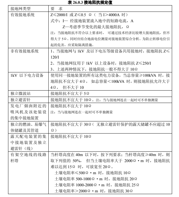 2.接地阻抗值應符合設計要求,當設計沒有規定時應符合表 26.0.3 的要求。試驗方法可參照國家現行標準《接地裝置工頻特性參數測試導則》DL475 的規定,試驗時必須排除與接地網連接的架空地線、電纜的影響。