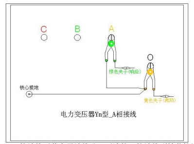 A相測量接線:1. 測量系統(tǒng)共一點接地,取變 壓器鐵芯接地。2. 黃夾子定義為輸入,鉗在 Yn 的‘O’點、綠夾子定義為測量,鉗在 A 相上。3. 地線連接網(wǎng)依次由綠夾子地線孔插入接地線至黃夾子地線孔,再連接一接地線到鐵芯接地。