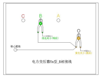 B相測量接線:1. 測量系統(tǒng)共一點接地,取變壓器鐵芯接地。2. 黃夾子定義為輸入,鉗在Yn 的‘O’點、綠夾子定義為測量,鉗在 B 相上。3. 地線連接網(wǎng)依次由綠夾子地線孔插入接地線至黃夾子地線孔,再連接一接地線到鐵芯接地。