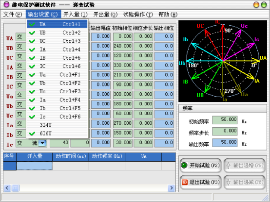 當需要使用的輸出相被選擇后,可以設定微機繼電保護測試儀各輸出相的起始參數,比如幅值、相位,接著可以設定幅值的變化步長和相位的變化步長。一旦通道的輸出達到大值或小值后,如果試驗還沒有停止,通道繼續保持輸出,不再遞增或遞減。