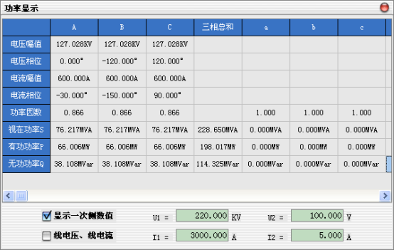 點擊菜單“試驗操作”—>“功率顯示”或Ctrl+P快捷鍵,可彈出功率顯示界面,顯示輸出的三相電壓、電流、功率等,可方便的進行校表試驗。