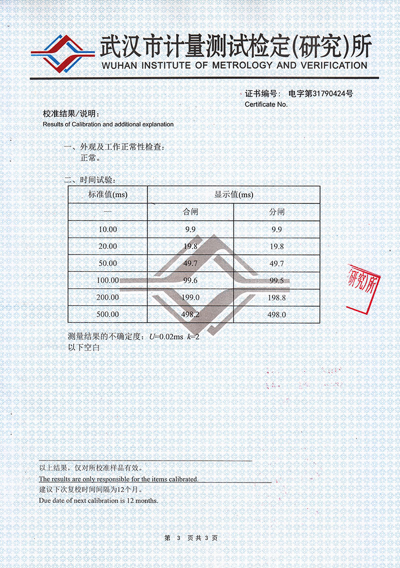 3.彈    跳:每斷口的合閘彈跳時(shí)間,彈跳次數(shù),彈跳過程,彈跳波形;每斷口的分閘反彈幅值。
