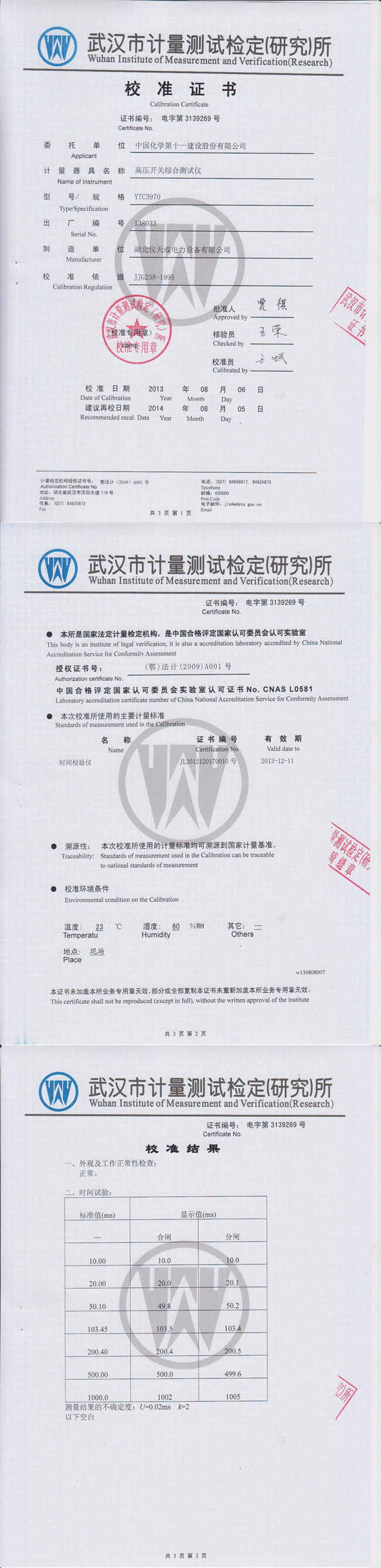 YTC3970高壓開(kāi)關(guān)動(dòng)特性測(cè)試儀鑒定證書