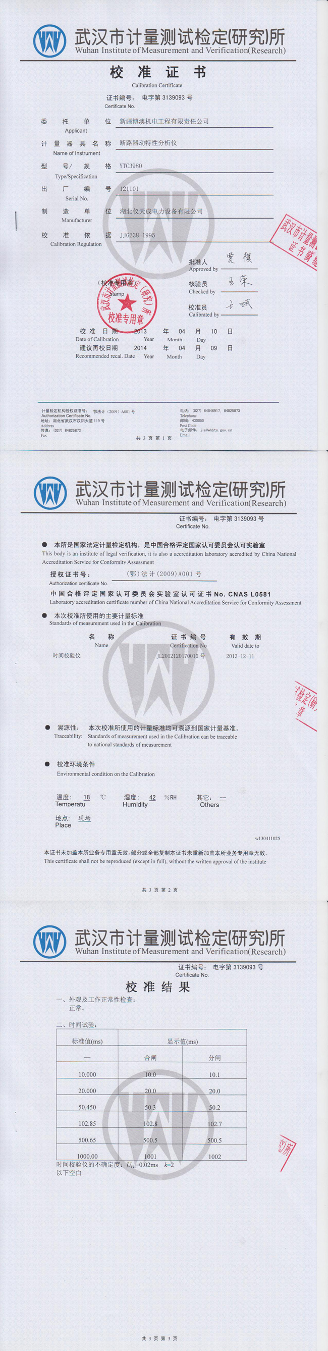 轉載:"YTC3980斷路器動特性分析儀資質證書" 請注明來源于儀天成電力。 更多技術問題請致電儀天成電力客戶服務:027-87876585,技術部專線:027-87876585,在線客服:719388481