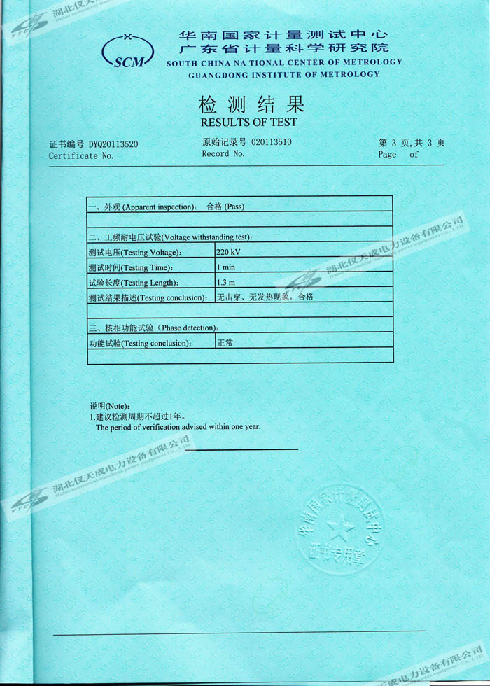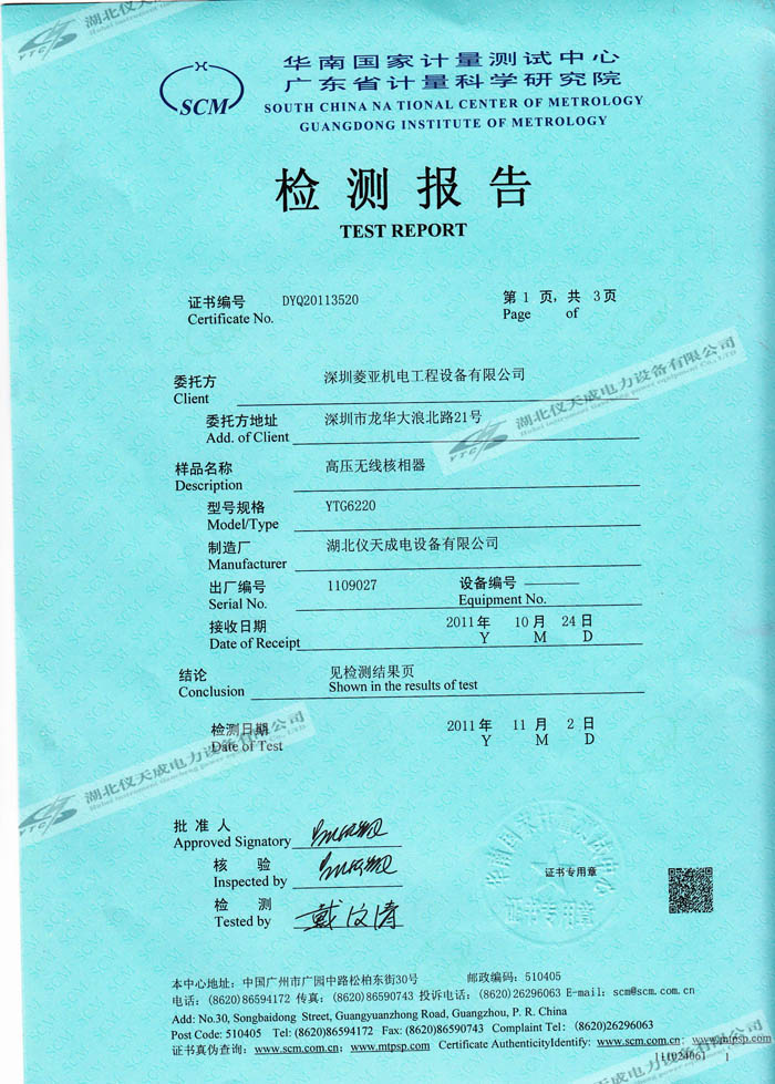轉載:"YTC6220高壓無線核相器的資質證書" 請注明來源于儀天成電力。 更多技術問題請致電儀天成電力客戶服務:027-87876585,技術部專線:027-87876585,在線客服:719388481