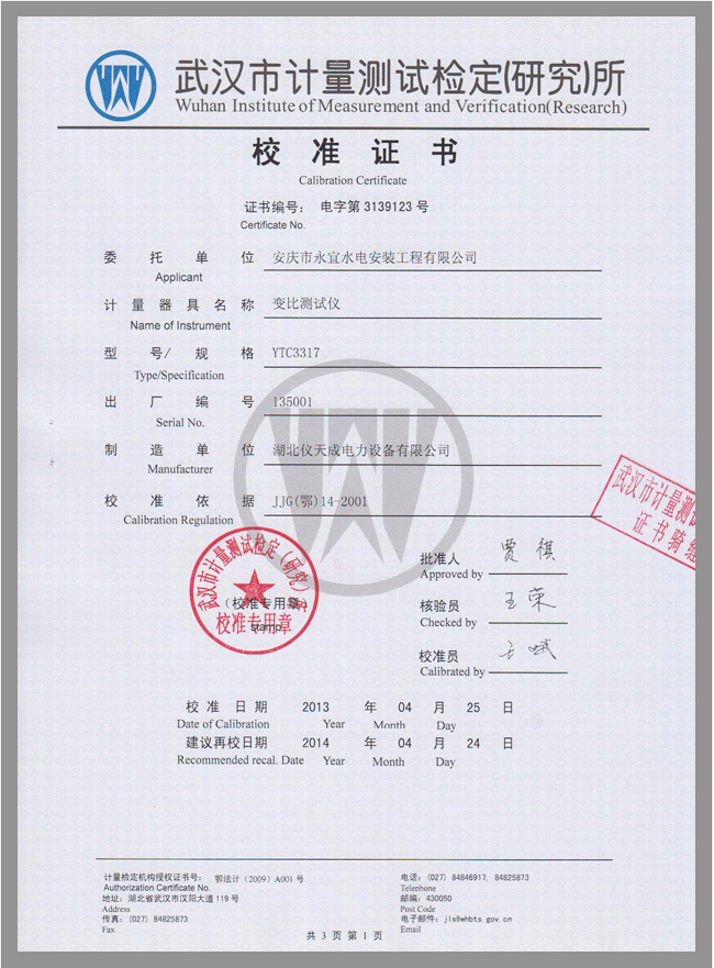 YTC3317全自動(dòng)變比組別測(cè)試儀鑒定證書(shū)